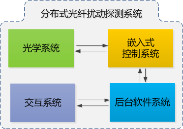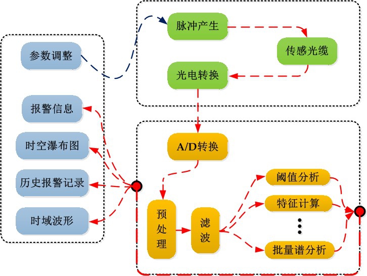 光學(xué)系統(tǒng)產(chǎn)生極窄線寬、功率適當(dāng)?shù)奶綔y脈沖,將探測脈沖注入傳感光纖并同時接收傳感光纖中返回的瑞利后向散射光,進行光電轉(zhuǎn)換,提供原始的擾動傳感信號。嵌入式控制系統(tǒng)和后臺軟件系統(tǒng)對傳感數(shù)據(jù)進行存儲、處理、計算、傳輸、交互。嵌入式控制系統(tǒng)通過數(shù)據(jù)采集設(shè)備將光探測器輸出的模擬擾動傳感信號轉(zhuǎn)換為數(shù)字信號,交付后臺軟件系統(tǒng)進行實時處理。后臺軟件系統(tǒng)讀取傳感數(shù)據(jù)后,進行預(yù)處理、濾波、批量 FFT 分析、特征量計算、閾值分析等,提供擾動數(shù)據(jù)的處理結(jié)果。交互系統(tǒng)將后臺軟件系統(tǒng)的處理結(jié)果實時顯示給用戶查看,包括報警信息、擾動曲線、時域波形、時空瀑布圖、調(diào)閱歷史報警記錄、查看歷史波形等功能,并可根據(jù)用戶的輸入,對系統(tǒng)的空間分辨率、脈沖重復(fù)頻率、探測脈沖寬度等參數(shù)進行適當(dāng)調(diào)整。