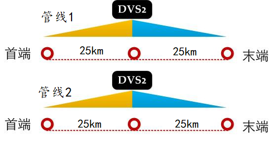 具體,可采用兩套雙通道 DVS 系統(tǒng)從中間向兩邊輻射實現(xiàn) 50km 的雙管線全覆蓋監(jiān)測。為降低系統(tǒng)建設(shè)成本,可將兩條管道全部安裝光纖傳感器,兩套傳感器共用一套DVS系統(tǒng),進行分時測量,即同一時間只能監(jiān)測一條管線,管線1和管線2輪流監(jiān)測。
