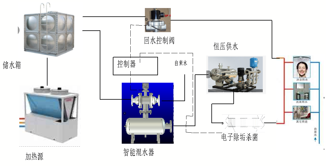 統(tǒng)的浴池?zé)崴到y(tǒng)不論采用何種加熱方式(空氣源熱泵、太陽能、燃?xì)忮仩t、燃油鍋爐、購買熱水等),為了滿足熱水供應(yīng),普遍采用加大儲水箱或提高熱水溫度來解決熱水供應(yīng)問題,由于浴室熱水用量的不確定性,因而造成了能源的浪費(fèi),增大了經(jīng)營者運(yùn)營成本。本公司提出的恒溫循環(huán)供水方法,為用戶解決了上述問題。系統(tǒng)原理圖如下: